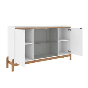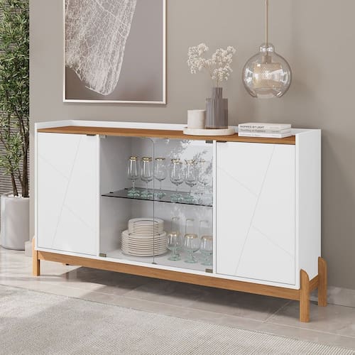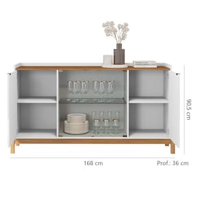 Características: Estrutura em MDF/MDP Pintura com acabamento UV 04 Portas sendo 02 de vidro temperado 4mm Dobradiças com sistema softclose Puxadores de metal Detalhes frisados Prateleira interna de vidro temperado 4mm Pés de madeira maciça