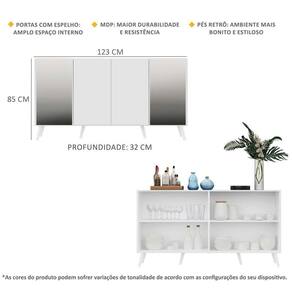 O Aparador Buffet com Espelho e Pés Retrô Vegas Multimóveis é produzido em MDP, que garante maior durabilidade, facilidade na limpeza, além de um acabamento superior. Com 4 portas, possui acabamento acetinado (cerca de 20% de brilho) e um excelente espaço interno para organizar seus pertences (as prateleiras internas suportam 5 Kg cada e o tampo 10 Kg). Os pés retrô, em polipropileno, e os detalhes com espelhos nas portas dão um charme especial ao móvel deixando-o com um visual leve e permitindo você compor um ambiente com ar vintage e moderno ao mesmo tempo. Os espelhos são de vidro (o que evita que a imagem fique distorcida) e lapidados, ou seja, passam por um processo para que as bordas não fiquem cortantes, o que garante maior segurança. Seu design minimalista, torna o móvel muito versátil, podendo ser utilizado de diversas maneiras e em qualquer ambiente.