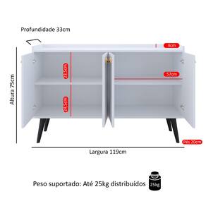 INFORMAÇÕES DO PRODUTO: * Altura: 75 centímetros; * Largura: 119 centímetroas; * Profundidade: 33 centímetros; * Peso Suportado: Até 25 kg distribuídos; * 4 Portas; * 2 Prateleiras Internas; * Pés palito de 20 cm em PVC; * Puxadores Concha (Lauren); * Produzido em MDP 15 mm; * Ripado em pintura impressa HD;