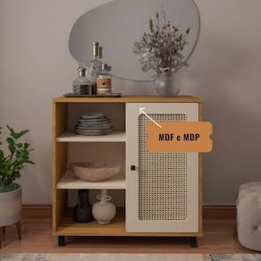 Buffet Charlotte: versatilidade e design único. Com detalhes em palhinha e cores harmoniosas, é ideal para armazenar louças, talheres e decorativos. Adapta-se a diversos espaços, elevando a estética e funcionalidade da sua casa.