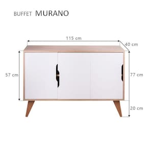 Buffet / Aparador / Balcão Modelo Murano cor Carvalho Treviso (Madeira Clara) com 3 portas o móvel perfeito para deixar seu ambiente com estilo e organizado. Possui dois compartimentos internos divididos por uma prateleira e 3 portas cor Brancas, conjunto apoiado em lindos pés torneados em madeira maciça. O móvel apresenta um estilo clean sem puxadores, apenas um recorte nas portas para abrir e fechar. As portas possuem um sistema de fechamento lento, que permite o uso com mais praticidade e conforto com apenas um leve toque. Montagem: Vai desmontado. Cor do Móvel: Carvalho Treviso (Madeira Clara) com portas Brancas. Cor dos pés: Amadeirado de cor clara. Medidas: Largura Total 115cm x Altura Total 77cm x Profundidade Total 40cm, portas A 53cm x L 37cm, pés A 20cm. Material: MDP com espessura 1,5cm Limpeza: Recomenda-se a limpeza com pano seco ou levemente umedecido. Importante: Este anúncio inclui somente o produto conforme descrição acima. Todos os elementos de decoração das fotos não acompanham o mesmo.