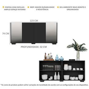 Aparador Buffet 4 portas com Espelho e Pés Quadrados Vegas é produzido em MDP, que garante maior durabilidade, além de um acabamento superior. Com 4 portas, possui acabamento acetinado (cerca de 20% de brilho) e um excelente espaço interno para organizar seus pertences (as prateleiras internas suportam 5 Kg cada e o tampo 10 Kg). Os pés quadrados, em polipropileno, facilitam na hora da limpeza. Os detalhes com espelhos nas portas deixam o móvel mais requintado, criando um ambiente moderno e charmoso. Os espelhos são de vidro (o que evita que a imagem fique distorcida) e lapidados, ou seja, passam por um processo para que as bordas não fiquem cortantes, o que garante maior segurança. Seu design minimalista, torna o móvel muito versátil, podendo ser utilizado de diversas maneiras e em qualquer ambiente.