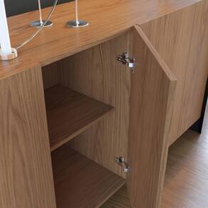 Além de um amplo espaço interno para guardar louças e demais aparelhos de jantar, possui um tampo amadeirado para objetos de decoração, taças, bebidas e que também pode servir de suporte para as refeições.