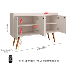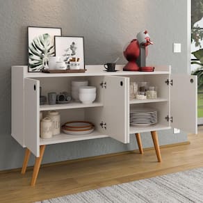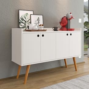 Ele conta com 4 portas, prateleiras internas e pés palito em madeira maciça, garantindo maior durabilidade ao produto. Também dispõe de um amplo tampo a qual pode ser utilizado para acomodar eletrodomésticos e itens decorativos.