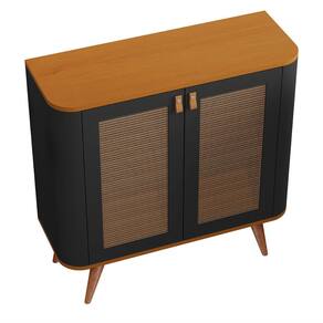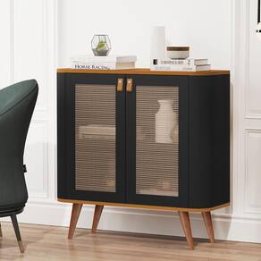 Com design retrô e acabamento sofisticado em MDF, ele traz portas com detalhe em ratam e pés em madeira maciça que valorizam qualquer ambiente.