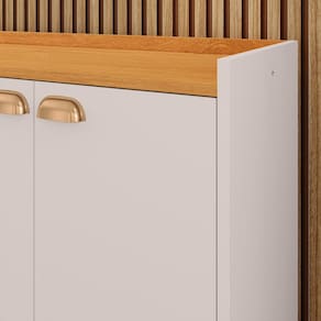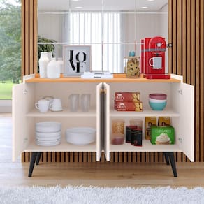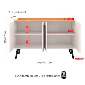 Ele conta com 4 portas com puxadores concha, prateleira organizadora interna e pés palito em PVC anti-umidade, garantindo maior durabilidade ao produto, também dispõe de um amplo tampo a qual pode ser utilizado para acomodar eletrodomésticos e itens decorativos.