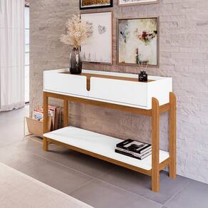Material da estrutura: laterais em MDF 15mm, prateleira e base MDF 15mm, tampo e divisórias MDP 15mm com pés em madeira maciça;