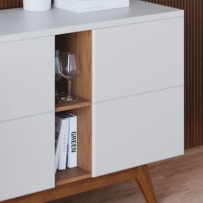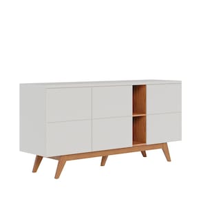 O Buffet Noronha, possui design contemporâneo com pés retrô em madeira maciça. Possui também três portas com detalhes chanfrados e pintura P.U. sem puxadores, utilizando o sistema fecho toque. O produto ainda conta com prateleiras internas reforçadas para a disposição das suas taças e aparelhos de jantar. Possui ainda, nichos decorativos em tom amadeirado, ótimo para decorações e livros. Com tampo de 25mm o Buffet Noronha possibilita a disposição de objetos em sua superfície, ideal para servir jantares em seu lar.