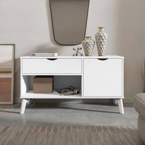 Estrutura: MDPAcabamento: Pintura U.V., alta resistência, que assegura durabilidade e beleza ao acabamentoGaveta: Sim, com corrediças telescópicasPorta: Sim, com dobradiças metálicasNicho: Sim, abaixo da gavetaPés: Sim, estilo reto palito, em madeira maciçaDimensões do produto montado