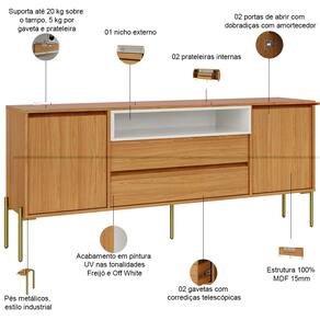 Seu design harmonioso une organização e estilo, oferecendo espaços inteligentes para tudo o que você precisa guardar ou exibir. Esse balcão buffet conta com portas que abrem para um amplo armazenamento, gavetas que deslizam suavemente para guardar talheres e utensílios, e um nicho aberto perfeito para suas peças decorativas favoritas - aquele toque pessoal que transforma uma casa em lar. Já a tonalidade adiciona calor e modernidade, enquanto o tampo generoso se torna o palco para seus jantares especiais ou momentos de café da manhã com estilo.