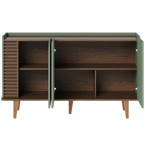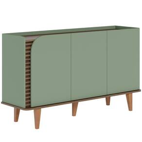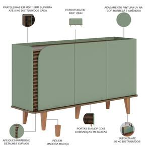 Criado para deixar qualquer ambiente deslumbrante, o Aparador Para Sala Buffet com 3 Portas Elora Hortelã Amêndoa, da Lyam Decor, é a combinação perfeita do design retrô e contemporâneo. Os pés de madeira maciça e linhas orgânicas evidenciam isso, ao passo que os apliques ripados destacam a porta de quina usinada. Já o tampo madeirado, elegantemente rebaixado, proporciona uma espécie de bandeja, o que esse balcão buffet único e cheio de personalidade. Para completar, a base com quinas arredondadas adiciona um toque suave à estrutura, enquanto o interior revela prateleiras reforçadas, perfeitas para a organização de louças e demais itens de jantar.