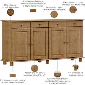 A começar pelo amplo espaço de armazenamento, com divisões internas inteligentes para organizar louças, cristais e mantimentos; gavetas práticas com sistema de deslize suave para talheres, toalhas e utensílios de mesa, além dos pés torneados e puxadores envelhecidos que contam histórias de tradição, enquanto possui acabamento perfeito para ambientes que exigem durabilidade e personalidade. Seja para cozinha de fazenda ou para uma cozinha rústica urbana, esse balcão buffet é a escolha certa.