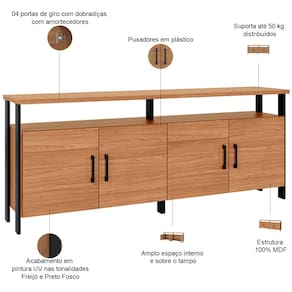 Já a estrutura em MDF de alta resistência garante durabilidade, enquanto os compartimentos amplos e acessíveis, facilitando o armazenamento de itens maiores como travessas, bandejas e até garrafas. Versátil, este balcão buffet funciona ainda como aparador decorativo, apoiando taças, vasos ou objetos de decoração em seu tampo. Pronto para se tornar o grande aliado da sua sala de jantar - onde organização e estilo industrial se encontram. Aproveite e garanta já o seu!