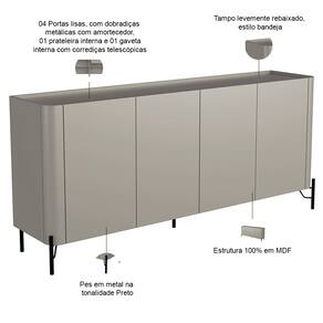 Fabricado em 100% MDF, esse buffet combina portas lisas e um design curvo - características do estilo orgânico - com pés metálicos industriais, criando um visual único e cheio de personalidade. Já com o tampo levemente rebaixado no estilo bandeja, esse aparador elegante oferece um espaço prático para exibir objetos decorativos ou servir drinks em encontros especiais. Por fim, seu amplo espaço interno garante organização sem comprometer a elegância, perfeito para guardar louças, toalhas ou itens de decoração.