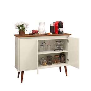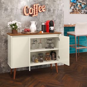 Aparador Buffet Retrô 3 Portas Luxo é ideal para sua sala! Com design retrô ele irá agregar muito mais charme e requinte ao seu ambiente. Possui três portas com dobradiças metálicas, nicho interno, uma prateleira, amplo tampo com borda invertida ideal para acomodar bebidas, objetos de decoração, taças etc. Elaborado em MDP de 15 mm, com pés de 30 cm em madeira maciça estilo retrô, esses atributos garantem ao produto maior resistência e durabilidade.