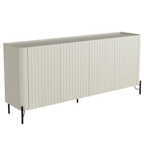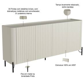 Fabricado em 100% MDF, esse buffet combina portas lisas e um design curvo - características do estilo orgânico - com pés metálicos industriais, criando um visual único e cheio de personalidade. Já com o tampo levemente rebaixado no estilo bandeja, esse aparador elegante oferece um espaço prático para exibir objetos decorativos ou servir drinks em encontros especiais. Além disso, o detalhe da porta Brise realça a beleza, ao passo que cria um efeito de textura ao balcão buffet. Por fim, seu amplo espaço interno garante organização sem comprometer a elegância, perfeito para guardar louças, toalhas ou itens de decoração.