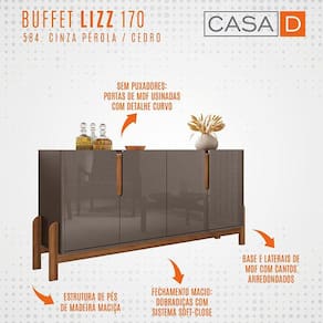 Marca: Casa D; Linha: Sala; Modelo: Buffet Lizz 170; Material da estrutura: MDP 15 mm, MDF 15 mm e 25 mm com pés de madeira maciça; Acabamento: Pintura Print Wood; Altura: 79 cm; Largura: 170 cm; Profundidade: 38,5 cm; Quantidade de portas: 04, com sistema Soft-Close (fechamento macio); Tipo de dobradiças: Metálicas (Soft-Close); Quantidade de gavetas: Não se aplica; Tipo de corrediças: Não se aplica; Com puxador: Sim, detalhe curvo; Material do puxador: Embutido; Quantidade prateleiras: 02; Peso suportado: 50 kg; Requer montagem: Sim (kit montagem incluso); Condição do item: Novo; É kit: Não; Altura da embalagem: 17,3 cm; Largura da embalagem: 41 cm; Comprimento da embalagem: 165,5 cm; Peso: 46,3 kg; Embalagem do envio: Papelão e plástico. Informações adicionais: - Os objetos que ambientam as fotos não acompanham o produto; - O produto será entregue desmontado; - É de inteira responsabilidade do cliente a montagem do produto e/ou instalação, custos de transporte por escadas e/ou elevadores, guincho ou içamento, assim como possíveis irregularidades provenientes de manuseio inadequado; - Embora o produto acompanhe o manual de montagem, verifique a complexidade antes de decidir montá-lo sozinho, recomendamos que contrate um profissional de sua confiança; - Fique atento, nossas cores podem sofrer alterações dependendo do seu monitor; - ANTES DE MONTAR O SEU PRODUTO, certifique-se que todas as instruções dispostas no manual, bem como todas as ferragens descritas, estejam presentes dentro da embalagem. Verifique se há alguma peça danificada, caso esteja, prestaremos a devida assistência dentro do prazo da garantia.