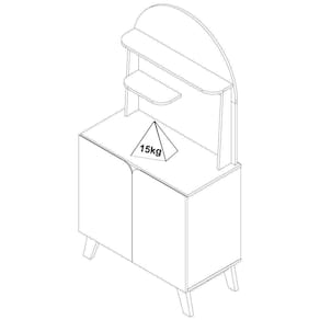 Características adicionais: 2 portas com dobradiças metálicas e cantos arredondados; Pés curvos de MDF 25mm; Estrutura em MDF/MDP de 15mm com pintura UV e acabamento fosco; 4 suportes metálicos para xícaras; 1 Passa fio