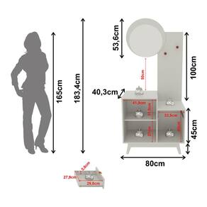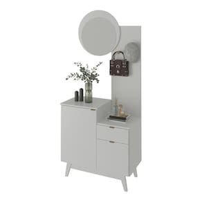 Características: - Produzido em MDP de 15/25mm, unindo leveza e robustez na medida certa. - Acabamento em pintura UV: mais resistência e beleza por muito mais tempo. - Espelho em vidro de 3mm que amplia o espaço e valoriza a iluminação do ambiente. - 2 portas e 1 gaveta para manter tudo organizado e sempre à mão. - Gaveta com corrediças metálicas, garantindo abertura suave. - 2 ganchos em aço cromado para pendurar bolsas ou chapéus: mais praticidade na rotina. - Pés no estilo retrô em PVC, que elevam o visual e facilitam a limpeza. - Puxadores metálicos práticos e minimalistas. - Montagem reversível: a espelheira e a porta podem ser montadas no lado esquerdo ou direito do móvel.