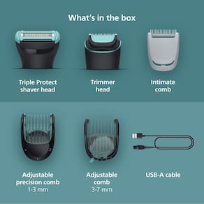 - Cabeças intercambiáveis e duplas para aparar pelos corporais eficientes e um barbear rente e agradável à pele para um aparador corporal masculino versátil