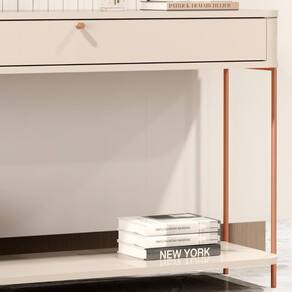 O aparador tucupí tem os cantos arredondados exclusivos da linha, base e tampo em MDF de 15mm, gaveta em MDF de 15mm com corrediças telescópicas além dos pés e puxadores em metal com design exclusivo.