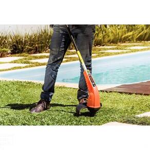 - DURANTE O USO: Durante o trabalho, use sempre calçados fechados e óculos de segurança. Não levante o aparador. Se isso for necessário, faça-o de forma que o fio de nylon fique do lado oposto ao operador. Procure conduzir o cabo elétrico por trás do aparador e sempre pelo lado já cortado da grama. Nunca trabalhe com o aparador sob chuva ou em gramados molhados e utilize-o sempre durante o dia ou com boa iluminação.