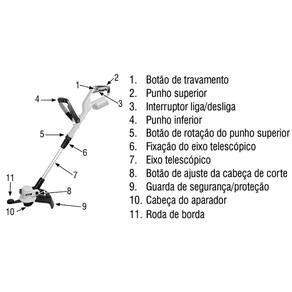 1 Aparador de grama. Acompanha: 1 carretel com 3 m de fio de nylon de 1,6 mm.