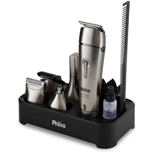 Especificações Técnicas: Potência: 3W; Marca: Philco; Bivolt Automático; Lâminas laváveis; 5 cabeças para 5 tipos de corte; Lâminas de aço; Funciona sem fio; Carrega na base; Tempo de carga de 8h; Autonomia de uso de 45min; A prova d’água; Pode ser utilizado na pele seca, úmida e molhada; Suporte para acessórios; Óleo lubrificante e pente; Acessório para corte de precisão; Acessório para bigode, barba e costeletas; Acessório rente a pele; Acessório para o corpo; Acessório de nariz e orelha; Pentes para corte nos tamanhos 3, 6, 9 e 12mm para o cabelo; Pentes para corte nos tamanhos 2,4,6 e 8mm para barba; Pentes para corte nos tamanhos 3, 6 e 9mm para o corpo;