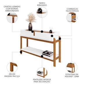 O Aparador de Sala 2 Gavetas 130cm Nay C14 Branco/Cedro, da Mpozenato, se destaca pelo design sofisticado, sendo uma excelente escolha para trazer funcionalidade e estilo ao ambiente. Com visual elegante, seus pés retrô em madeira maciça não só adicionam charme, mas também garantem estabilidade e robustez. Equipado com duas gavetas que possuem corrediças telescópicas, o Aparador Para Sala oferece praticidade no armazenamento, permitindo um acesso suave e eficiente. A pintura P.U das gavetas não só agrega um toque estético refinado, mas também aumenta a durabilidade e resistência da peça. A estrutura é composta por tampo de MDP 15mm, base e prateleiras em MDF 15mm, com bordas arredondadas e acabamento laqueado, destacando a atenção aos detalhes e a qualidade do produto. O acabamento em pintura UV confere elegância, tornando o Aparador Buffet uma peça perfeita na decoração da Sala de Estar. Não perca tempo, adicione agora mesmo o Aparador ao carrinho. ESPECIFICAÇÕES Dimensões do ProdutoLargura: 130,1 cm. Altura: 87,5 cm. Profundidade: 38,6 cm. Peso: 31,6 Kg. Características do ProdutoMaterial da Estrutura: MDP/MDF. Espessura das Chapas: 15 mm. Peso Suportado: 30 Kg distribuídos. Acabamento: Pintura UV/Pintura PU. Escala de Brilho: Semi-Fosco. Possui Gavetas: Sim. Quantidade de Gavetas: 2 Gavetas. Material das Gavetas: MDF usinadas. Material das Corrediças: Metálicas telescópicas. Possui Prateleiras: Sim. Quantidade de Prateleiras: 1 Prateleira. Possui Portas: Não. Possui Nicho: Não. Possui Pés: Sim. Quantidade de Pés: 4 Pés. Material dos Pés: Madeira maciça. Diferenciais:- Design moderno. - Pés de madeira maciça. - Com gaveta em MDF usinadas. - Corrediças telescópicas. Sistema de Montagem: Cavilhas/Parafusos/Minifix. Manual de Montagem: Sim. Complexidade da Montagem: Média. Volumes: 1 Volume. Conteúdo da Embalagem: 1 Aparador. do Fabricante: 90 dias contra defeito de fabricação. Montagem: Recomendamos que seja feita por um . Recomendação de Limpeza: Utilize pano úmido. Observações importantes:- Produto para uso residencial em ambiente interno, não devendo ficar exposto diretamente ao sol, calor e umidades excessivas.- Pode haver alguma diferença de tonalidade entre a imagem e o produto real, por conta do tratamento de imagens e a calibração de cores do seu monitor.- As imagens são meramente ilustrativas, não acompanham objetos de decoração e eletrônicos.- Confira o estado da embalagem, não devendo assinar o comprovante em caso de danos.- Não asseguramos, no ato da , por subir escadas/elevadores, pelo transporte por guincho em apartamentos ou montagem, desmontagem e instalações. Eventuais despesas são por conta do comprador.- Confira as dimensões do produto e certifique-se de que passará normalmente por supostos elevadores, portas, escadas e/ou corredores de sua residência.