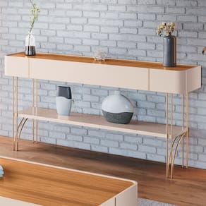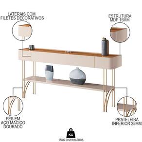 O Aparador de Sala com Prateleira Vivant Off White/Cinamomo, da HB Móveis é um móvel versátil e elegante que além de ser funcional vai deixar a sua casa ainda mais linda, confira! O Aparador de Sala pode ser tanto na Sala De Estar quanto no hall de entrada, na cozinha ou no quarto. Ele serve para apoiar objetos decorativos, livros, plantas, luminárias e até mesmo servir de bar. Um modelo que se destaca pela beleza e qualidade é o Aparador Com Prateleira, ideal para compor a decoração ou ser utilizado como divisor de ambientes. Esse aparador tem um design contemporâneo, que combina as formas orgânicas dos cantos arredondados com os filetes decorativos nas laterais, que dão um toque de charme e sofisticação. Fabricado em MDF de 15mm, materiais resistentes e duráveis, que garantem a estabilidade e a segurança do móvel. Os pés são de aço maciço, com acabamento em tom dourado, que conferem elegância e requinte ao aparador. A prateleira inferior de 25mm é perfeita para guardar revistas, cestos ou outros itens que você quiser organizar ou expor. Uma peça que valoriza o seu ambiente, trazendo funcionalidade e estilo para a sua casa.Aproveite! Adicione em seu carrinho de compras e garanta o seu. ESPECIFICAÇÕES Dimensão do ProdutoLargura: 160 cm. Altura: 76 cm. Profundidade: 36 cm. Peso: 24,7 Kg. Características do ProdutoMaterial da Estrutura: MDF 15/25 mm. Peso Suportado: 15 Kg distribuídos. Acabamento: Impressão UV. Escala de Brilho: Brilho/Fosco. Possui Gavetas: Não. Possui Prateleiras: Sim. Quantidade de Prateleiras: 1 Prateleira. Possui Nicho: Não. Possui Pés: Sim. Tipo de Pés: Aço maciço 3/8. Diferenciais:- Design moderno.- Pés em aço maciço dourado.- Laterais com filetes decorativos.Sistema de Montagem: Cavilhas/Parafusos/Girofix. Manual de Montagem: Sim. Complexidade da Montagem: Média. Volumes: 2 Volumes. Conteúdo da Embalagem: 1 Aparador. do Fabricante: 90 dias contra defeito de fabricação. Montagem: Recomendamos que seja feita por um . Recomendação de Limpeza: Utilize pano úmido. Observações importantes:- Produto para uso residencial em ambiente interno, não devendo ficar exposto diretamente ao sol, calor e umidades excessivas.- Pode haver alguma diferença de tonalidade entre a imagem e o produto real, por conta do tratamento de imagens e a calibração de cores do seu monitor.- As imagens são meramente ilustrativas, não acompanham objetos de decoração e eletrônicos.- Confira o estado da embalagem, não devendo assinar o comprovante em caso de danos.- Não asseguramos, no ato da , por subir escadas/elevadores, pelo transporte por guincho em apartamentos ou montagem, desmontagem e instalações. Eventuais despesas são por conta do comprador.- Confira as dimensões do produto e certifique-se de que passará normalmente por supostos elevadores, portas, escadas e/ou corredores de sua residência.