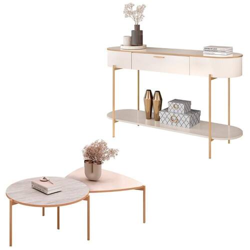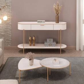 O Aparador de Sala apresenta design moderno e sofisticado, com cantos arredondados que conferem leveza ao ambiente. Seu tampo, usinado com bordas suavemente arredondadas e adornado com pintura PU dourada, valoriza cada detalhe. Equipado com uma gaveta de puxador metálico dourado, oferece organização para objetos e utensílios. A prateleira inferior, também com cantos arredondados, é ideal para exibir itens decorativos. Sua estrutura reforçada com pés metálicos dourados garante resistência, durabilidade e facilidade de limpeza, tornando-o prático e funcional. As Mesas de Centro, com design igualmente moderno e sofisticado, adicionam leveza e criam um espaço elegante e acolhedor. Uma delas possui tampo circular, enquanto a outra apresenta tampo triangular. Ambas têm bordas adornadas com pintura PU dourada, destacando o requinte. A estrutura reforçada com pés metálicos dourados assegura durabilidade e facilita a limpeza, tornando-as perfeitas para complementar a decoração da sua Sala de Estar.