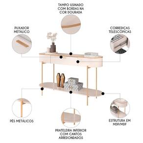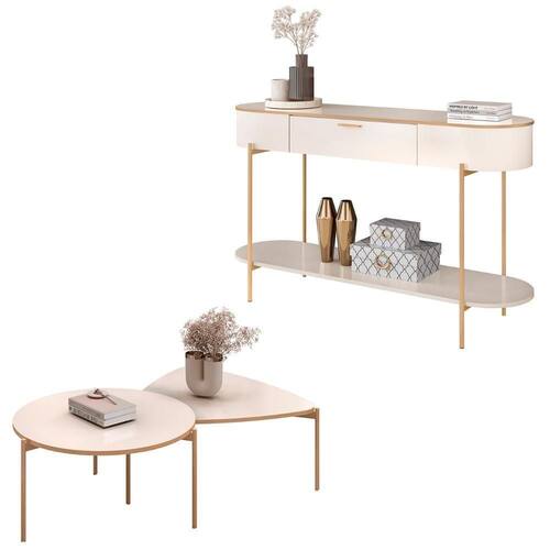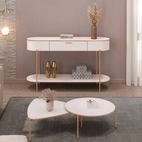 O Aparador de Sala apresenta design moderno e sofisticado, com cantos arredondados que conferem leveza ao ambiente. Seu tampo, usinado com bordas suavemente arredondadas e adornado com pintura PU dourada, valoriza cada detalhe. Equipado com uma gaveta de puxador metálico dourado, oferece organização para objetos e utensílios. A prateleira inferior, também com cantos arredondados, é ideal para exibir itens decorativos. Sua estrutura reforçada com pés metálicos dourados garante resistência, durabilidade e facilidade de limpeza, tornando-o prático e funcional. As Mesas de Centro, com design igualmente moderno e sofisticado, adicionam leveza e criam um espaço elegante e acolhedor. Uma delas possui tampo circular, enquanto a outra apresenta tampo triangular. Ambas têm bordas adornadas com pintura PU dourada, destacando o requinte. A estrutura reforçada com pés metálicos dourados assegura durabilidade e facilita a limpeza, tornando-as perfeitas para complementar a decoração da sua Sala de Estar.
