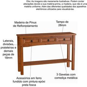Característica do Aparador: - Madeira de Pinus de Reflorestamento; - 100% Maciço; - Tampo Maciço de 28mm; - Corrediça metálica; - Pés de madeira; - Acabamento com Verniz Fosco; - Não acompanha itens de decoração ou quaisquer objetos fora o móvel na imagem;