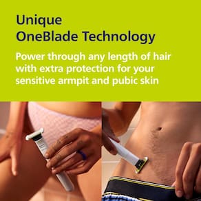 — com a lâmina OneBlade Intimate SkinProtect de dupla face, você pode facilmente se barbear para cima ou para baixo e modelar com confiança.