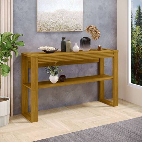 Material principal: 100% MDF Acabamento: pintura ultravioleta (UV) com veios amadeirados em semi-brilho Pés: em MDF robusto, com espessura aproximada de 2,5 cm Prateleiras: sim, internas, reforçadas para suportar peso moderado Capacidade máxima de carga: cerca de 45 kg Peso do produto (sem embalagem): aproximadamente 21 kg Garantia: 3 meses Itens inclusos: 1 aparador, kit de ferragens e manual de montagem Escala de brilho: semi-brilho, destacando o padrão amadeirado Carvalho Oro