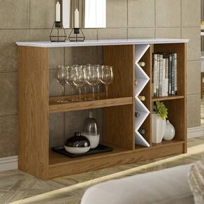 ESPECIFICAÇÕES: Estrutura em MDF Pintura UV Tampo em MDF Vidro 3mm colado sobre o tampo Prateleiras Adega para garrafas