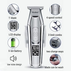 Aparador Kemei Km-5027 100v/240v Aparador De Cabelo Se você tiver alguma dúvida, pode nos consultar a qualquer momento, e responderemos assim que recebermos as novidades.Com este aparador de cabelo multifuncional Comey, você pode desfrutar de um produto de alta qualidade com ótimos resultados estéticos. Graças aos seus recursos, você poderá exibir seus looks favoritos.O que você precisa saber sobre este produtoCaracterísticas adicionais: Máquina de cortar cabelo.É sem fio e funciona com uma bateria recarregável.O tempo máximo que você pode usar é de 270 minutos.Carregue-o a 100% em cerca de 2 horas.Possui visor digital.Corta até 3 mm.Suas lâminas são feitas de aço carbono.Acompanha 3 pentes. Marca: Kemei 5027