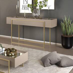 Minimalismo é sobrenome do Aparador Suri, da DJ Móveis. Os pés metálicos até remetem ao estilo industrial, porém a pintura epóxi dourada combinada com a estrutura de MDF e aplicação de espelho no tampo deixa esse aparador para sala de estar com um toque sofisticado e elegante.