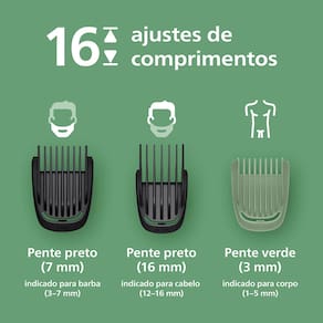 Cabelo: 12 mm e 16 mmCorpo: 3 mm e 5 mmBarba: 3 mm, 5 mm e 7 mmCorpo e áreas íntimas: 1 mm