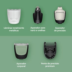 13 ferramentas para cuidados completosAjustes de comprimento de 0,5 mm a 16 mmEtapas de precisão com controle de até 0,2 mmAparador de metal para linhas definidasAparador de detalhes para acabamento precisoAparador para pelos do corpo com pontas arredondadasAparador para nariz e orelhasPega ergonômica para maior controleFácil limpeza e totalmente lavável