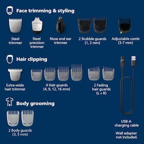 - Inclui: 18 ferramentas e acessórios. Aparador de aço, aparador de precisão em aço, aparador de nariz e orelhas, aparador de cabelo extra largo, protetor ajustável de 3-7 mm, 4 protetores de cabelo largos, 2 protetores de cabelo largos que desbotam, 2 protetores corporais, 2 protetores de barba.