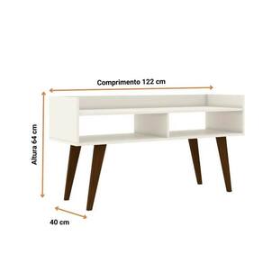 O rack para TVs de até 50 polegadas RT 3113 possui estrutura em MDP 15mm e acabamento em pintura UV. Costas 3mm. Possui 2 nichos que suportam 5kg cada e 4 pés em madeira maciça com altura de 37cm. Tampo em MDP 15mm. Produto suporta até 25kg. Conteúdo da embalagem: móvel, ferragens e manual de montagem. A fixação das peças e/ou acessórios é feita por parafusos, cavilhas e minifix. Para uma limpeza mais efetiva, utilizar apenas pano macio umedecido e sabão neutro. Não utilizar produtos abrasivos. Garantia de 03 meses contra defeitos de fabricação. Medidas do produto (AxLxP): 64x122x40cm. Peso do produto: 15kg. Marca: Não Informado