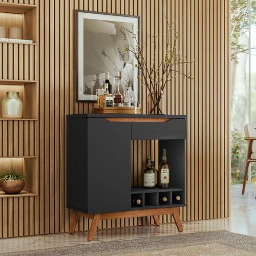 O Aparador Retrô Adega Tóquio, possui o tampo de 25 mm. A porta e a gaveta possuem usinagem que serve como puxadores, as dobradiças e corrediças são metálicas. Possui também uma adega para 04 garrafas de vinho, e mais um compartimento aberto para colocar objetos para seu barzinho. Os pés são chassi envernizado, um produto ótimo que serve para você colocar em um ambiente como aparador e ao mesmo tempo como um buffet com adega.