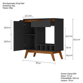 - Quantidade de Prateleiras: 2 - Quantidade de Portas: 1 - Quantidade de Pés: 4 - Quantidade de Gaveta: 1 - Peso do Produto Montado: 23 - Peso Máximo Suportado: 30 - Medida do Produto Montado (LXCXA): 37cmx80cmx85,6cm - Acabamento: Pintura UV - Escala de Brilho: Acetinado - Material da Estrutura: MDF E MDP 15 e 25 mm - Produto Necessita de Montagem?: Sim - Tipo de Gaveta: Gaveta com corrediça deslizante - Tipo de Pés: Pés em madeira chassi envernizado - Tipo de Porta: Rotação - Tipo de Prateleira: Fixa - Recomendações de manutenção: Pano úmido. Não aplicar lustra móveis. - Volumes: 1 Volume - Garantia: 3 Meses