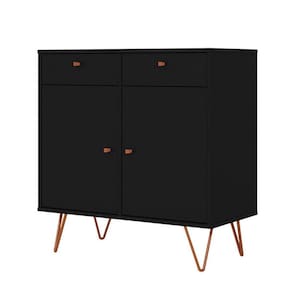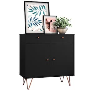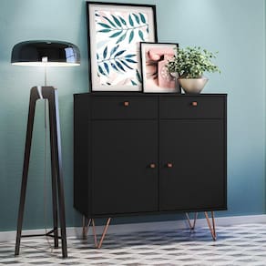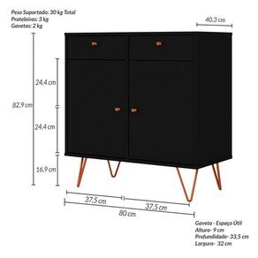 O Aparador Retrô Metal Ônix é um móvel com uma pegada retrô, combina em qualquer ambiente para sua decoração, salas, quarto, etc. Se você quiser fazer o cantinho do café na sua sala ele ficará ótimo, tem como diferencial seus pés de metal em formato agulha de 17 cm. Possui duas portas de rotação com dobradiças metálicas, duas gavetas com corrediças deslizantes e metálicas, duas prateleiras móveis internas com mais uma furação de opção de altura, para colocar objetos.