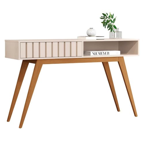 O aparador ripado tem tampo, base e laterais em MDF de 1,5cm, gaveta ripada com corrediças telescópicas, nicho porta objetos, além dos pés e travessas em madeira maciça com exclusividade da linha açaí.