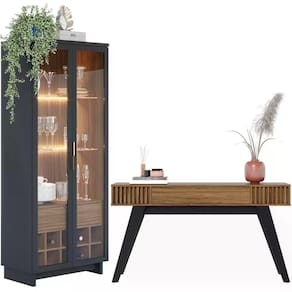 Aparador Riveira E Cristaleira Guanabara, é uma excelente escolha para compor a sua sala de estar ou jantar tornando o ambiente muito mais elegante. Estrutura em MDP de 15 e 25 mm, acabamento em pintura UV (Fosco/Brilho). Composta por portas com dobradiças metálicas, frentes das portas em vidro, prateleiras de vidro iluminadas por fitas de LED, adega com espaço para 10 garrafas, gaveta interna com corrediças telescópicas para guardar travessas e aparelhos de jantar, puxadores, e acompanham sapatas plásticas. Aparador conta com tampo espaçoso, ripas decorativas em suas laterais, gaveta multi com corrediças telescópicas, puxador, pés em Madeira Maciça, e acompanham sapatas plásticas. Estes móveis chegarão na sua casa separado em 04 volumes.