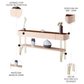 O Aparador de Sala pode ser tanto na Sala De Estar quanto no hall de entrada, na cozinha ou no quarto. Ele serve para apoiar objetos decorativos, livros, plantas, luminárias e até mesmo servir de bar. Um modelo que se destaca pela beleza e qualidade é o Aparador Com Prateleira, ideal para compor a decoração ou ser utilizado como divisor de ambientes. Esse aparador tem um design contemporâneo, que combina as formas orgânicas dos cantos arredondados com os filetes decorativos nas laterais, que dão um toque de charme e sofisticação. Fabricado em MDF de 15mm, materiais resistentes e duráveis, que garantem a estabilidade e a segurança do móvel. Os pés são de aço maciço, com acabamento em tom dourado, que conferem elegância e requinte ao aparador. A prateleira inferior de 25mm é perfeita para guardar revistas, cestos ou outros itens que você quiser organizar ou expor. Uma peça que valoriza o seu ambiente, trazendo funcionalidade e estilo para a sua casa.
