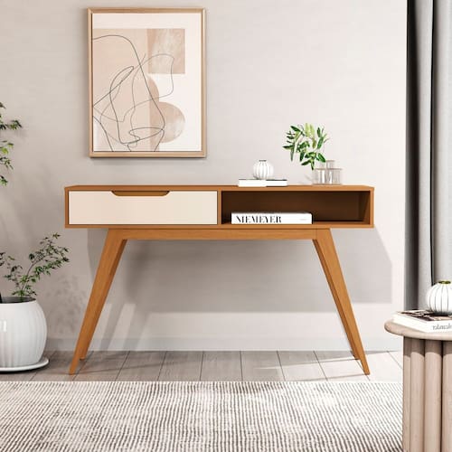 O aparador Tucumã possui tampo, base e laterais em MDF de 15cm, gaveta com puxador usinado e corrediça telescópica, nicho porta objetos, além dos pés e travessas em madeira maciça.