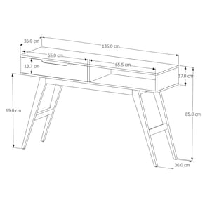 O aparador Tucumã possui tampo, base e laterais em MDF de 15cm, gaveta com puxador usinado e corrediça telescópica, nicho porta objetos, além dos pés e travessas em madeira maciça.